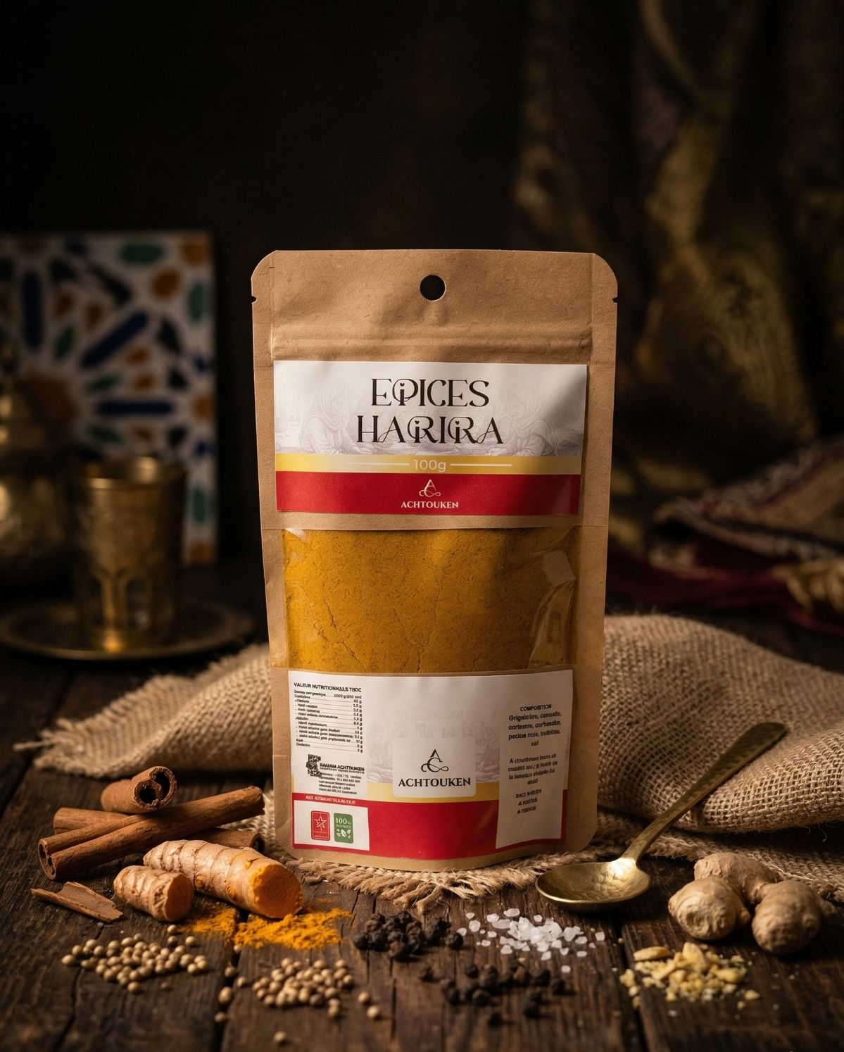 Un mélange d’épices 100% naturel, spécialement conçu pour préparer une Harira savoureuse et parfumée. Parfait pour soupes marocaines traditionnelles et plats mijotés. Qualité premium Achtouken.